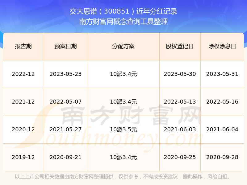 交大思諾最新一次公布的分紅方案為10派3.4元。本次權(quán)益分派股權(quán)登記日為2023年5月30日,除權(quán)除息日為2023年5月31日,派息日為2023年5月31日。