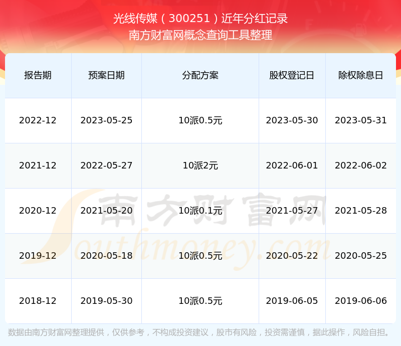 光線傳媒最新一次公布的分紅方案為10派0.5元。本次權(quán)益分派股權(quán)登記日為2023年5月30日,除權(quán)除息日為2023年5月31日,派息日為2023年5月31日。