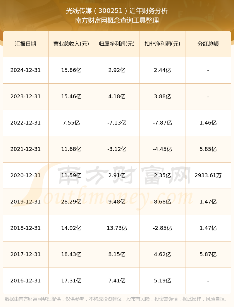 光線傳媒公司2024年實現(xiàn)營業(yè)收入15.86億元,同比增長2.58%;凈利潤2.92億元,同比增長-30.11%;毛利率37.71%。