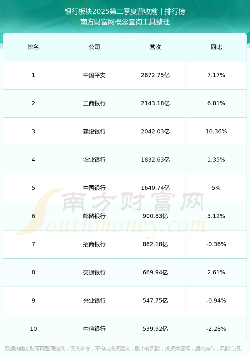 按照南方財(cái)富網(wǎng)概念查詢工具統(tǒng)計(jì),該股所屬板塊為銀行板塊,該板塊共有44只股票,齊魯銀行2025第二季度營(yíng)收在該板塊中排名為第28名,該板塊2025第二季度營(yíng)收排名前十的股票如下表: