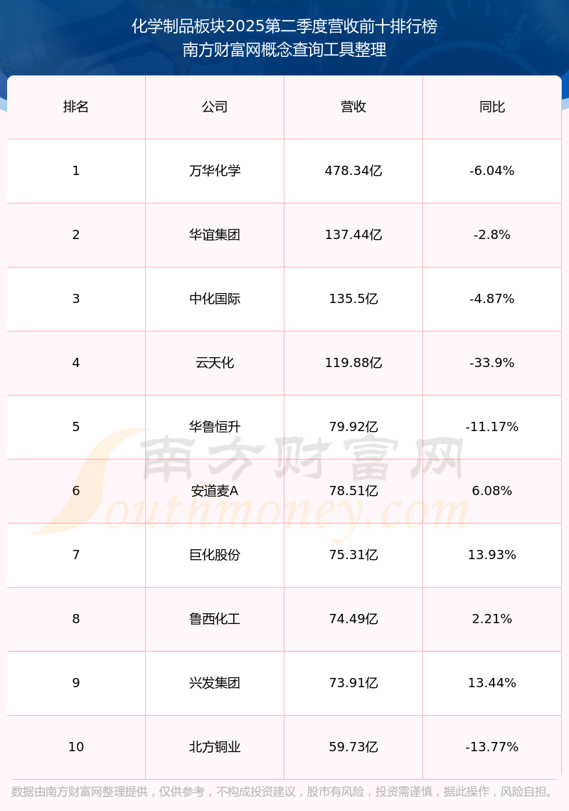 按照南方財富網(wǎng)概念查詢工具統(tǒng)計,該股所屬板塊為化學(xué)制品板塊,該板塊共有236只股票,滄州大化2025第二季度營收在該板塊中排名為第52名,該板塊2025第二季度營收排名前十的股票如下表: