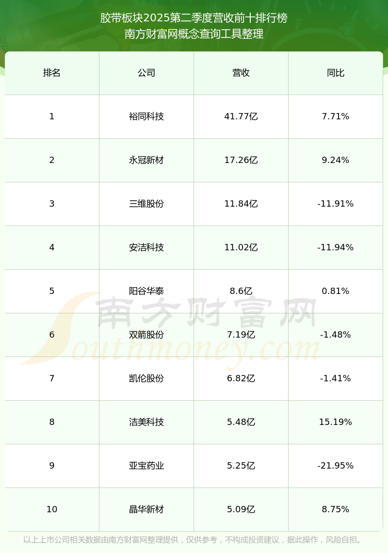 按照南方財(cái)富網(wǎng)概念查詢工具統(tǒng)計(jì),該股所屬板塊為膠帶板塊,該板塊共有16只股票,永冠新材2025第二季度營(yíng)收在該板塊中排名為第2名,該板塊2025第二季度營(yíng)收排名前十的股票如下表: