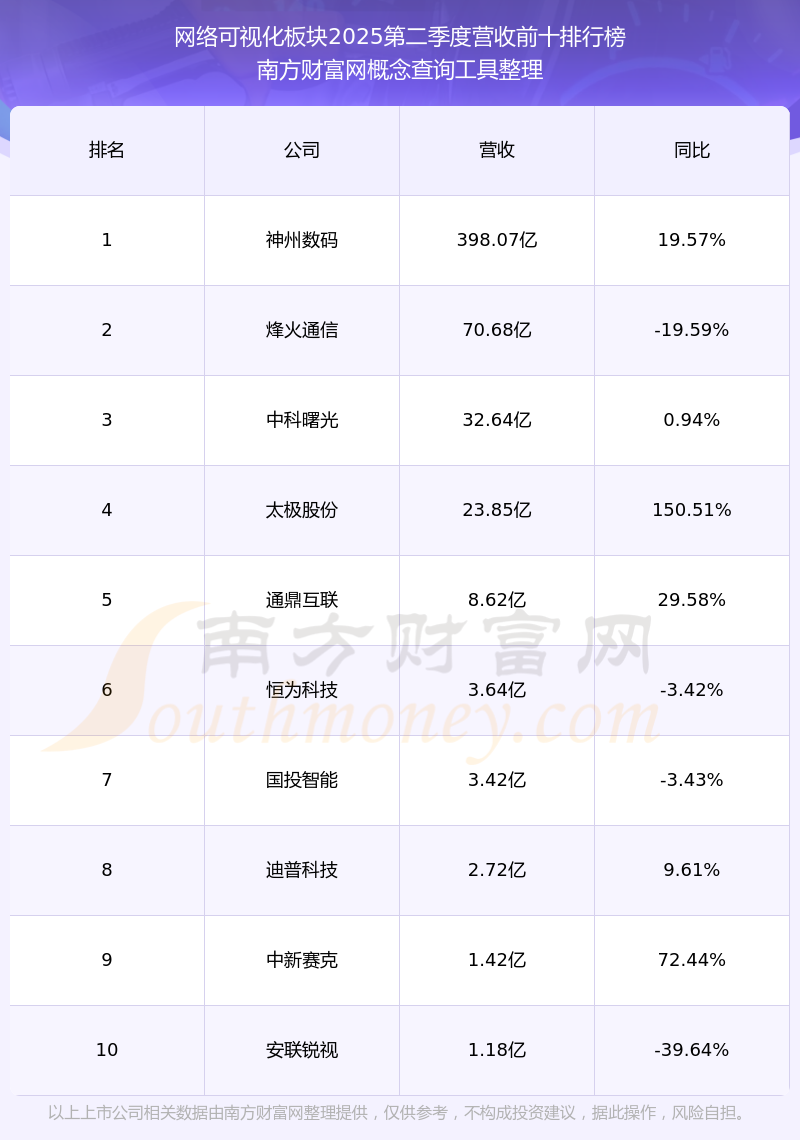 按照南方財(cái)富網(wǎng)概念查詢工具統(tǒng)計(jì),該股所屬板塊為網(wǎng)絡(luò)可視化板塊,該板塊共有13只股票,恒為科技2025第二季度營(yíng)收在該板塊中排名為第6名,該板塊2025第二季度營(yíng)收排名前十的股票如下表: