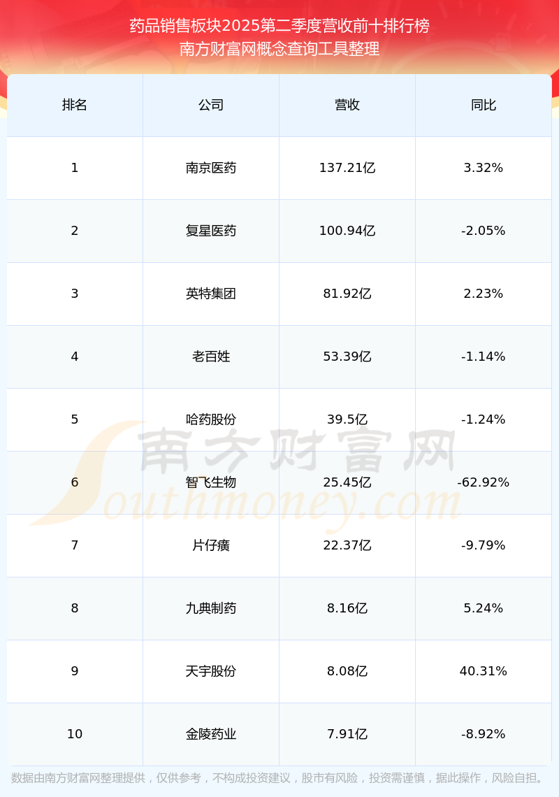 按照南方財富網(wǎng)概念查詢工具統(tǒng)計,該股所屬板塊為藥品銷售板塊,該板塊共有19只股票,華海藥業(yè)2025第二季度營收在該板塊中排名為第19名,該板塊2025第二季度營收排名前十的股票如下表: